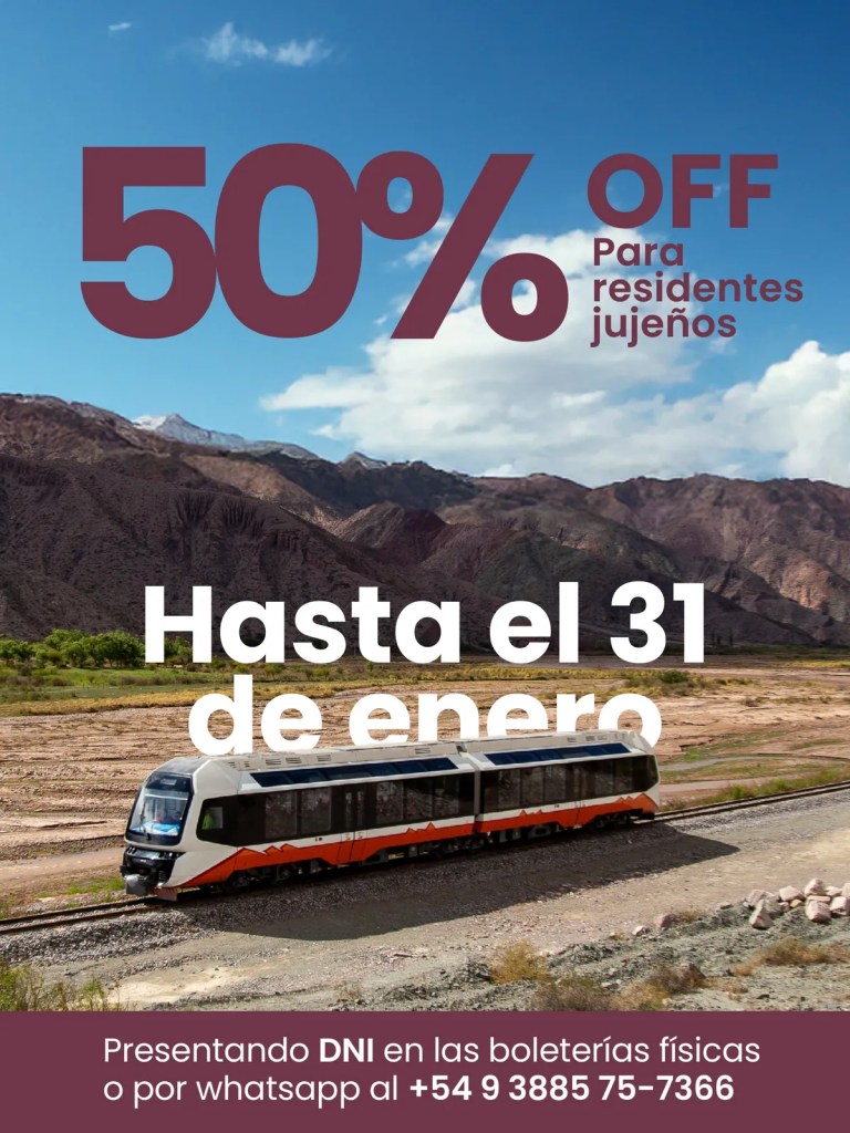 El Tren Solar de la Quebrada extendió hasta el 31 de enero la promoción “Orgullo Jujeño”, un beneficio exclusivo para residentes de la provincia que ofrece 50% de descuento para recorrer la Quebrada de Humahuaca en el primer tren solar de Latinoamérica.