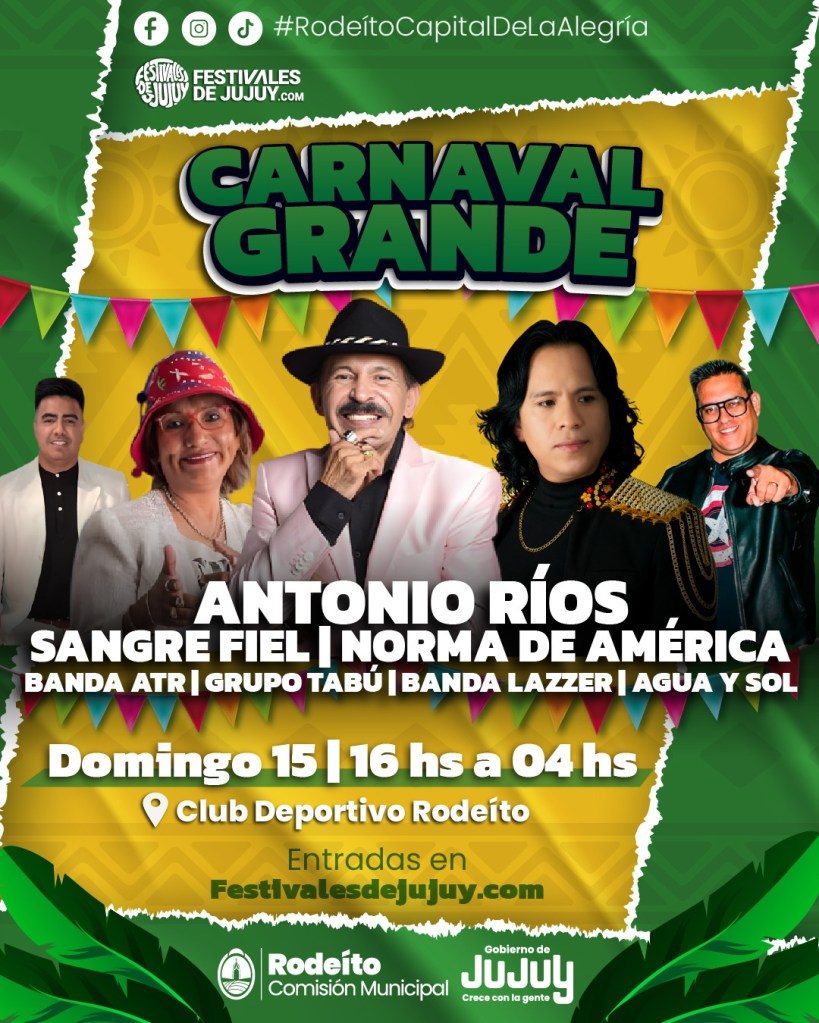 El Carnaval Grande tendrá una cartelera de primer nivel con Antonio Ríos, Sangre Fiel, Norma de América, Malagata y el Changuito Yuteño, entre otros. Como incentivo, el municipio lanzó un combo carnavalero: por 35 mil pesos se podrá acceder al Jueves de Comadres, el desentierro y los dos días del Carnaval Grande.