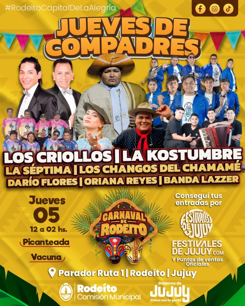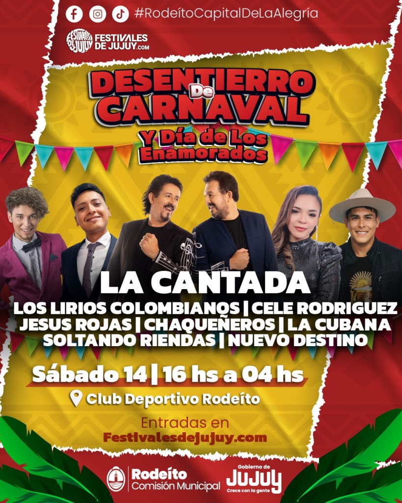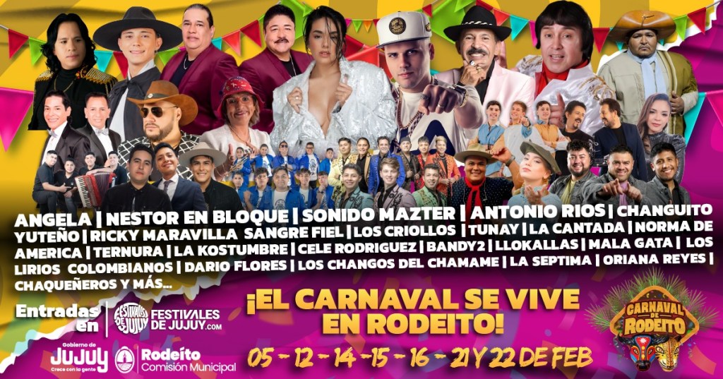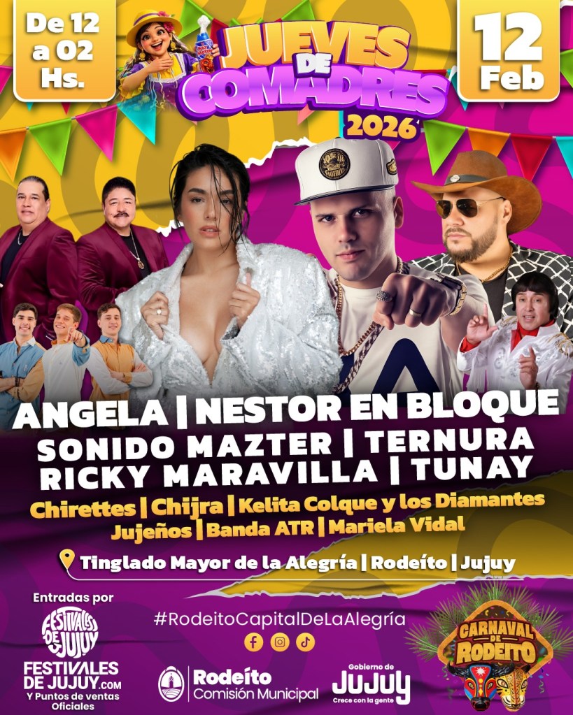 Las celebraciones arrancan este jueves con la presentación de Los Criollos, en un espacio que combina música, baile y un parador con pileta, muy elegido por las familias. Para el Jueves de Comadres, Rodeíto apuesta fuerte con la presencia de Ángela Leiva, una de las artistas más convocantes del momento. Además, el 12 de febrero subirán al escenario Néstor en Bloque, Sonido Master, Ternura y Ricky Maravilla, en una jornada que promete ser multitudinaria.