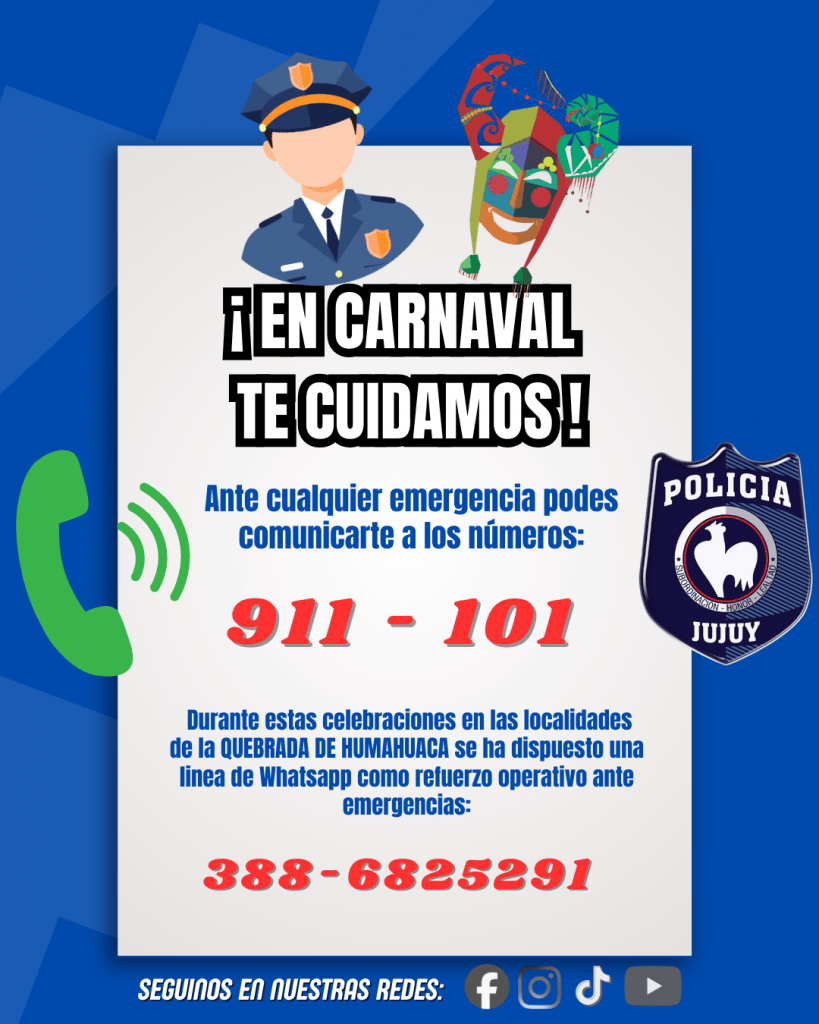 Quienes visiten Jujuy durante el Carnaval 2026 deben saber que ante cualquier emergencia están disponibles las líneas 911 y 101 en toda la provincia, y que en la Quebrada de Humahuaca también se habilitó un número directo con WhatsApp (388-6825291), dependiente del Centro de Monitoreo de la Unidad Regional Nº 3, para enviar ubicación en tiempo real, fotos, videos, audios o realizar consultas y denuncias no urgentes.