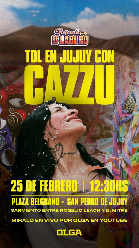 San Pedro de Jujuy se prepara para vivir una jornada especial este miércoles 25 de febrero, cuando Cazzu sea la gran invitada del programa de streaming Tapados de Laburo, que transmitirá en vivo desde la Plaza General Manuel Belgrano a partir de las 12.30 horas.