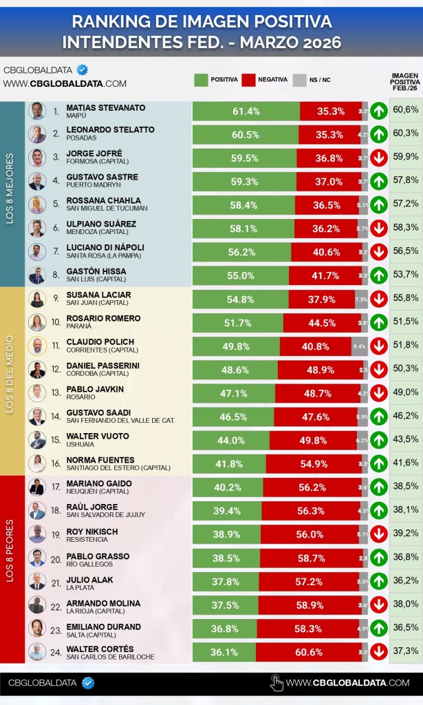 En el ranking general, los primeros lugares corresponden a intendentes como Matías Stevanato (Maipú), Leonardo Stelatto (Posadas) y Jorge Jofré (Formosa), todos con niveles de aprobación cercanos o superiores al 60%. En contraste, el tramo inferior del listado reúne a varios jefes comunales con altos niveles de desgaste en sus gestiones.