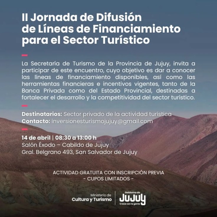 El Gobierno de Jujuy realizará el 14 de abril la II Jornada de Difusión de Líneas de Financiamiento Turístico, una instancia gratuita destinada a emprendedores y empresarios que busca facilitar el acceso al crédito en un contexto económico complejo, donde el turismo se consolida como uno de los sectores con mayor dinamismo en la provincia.