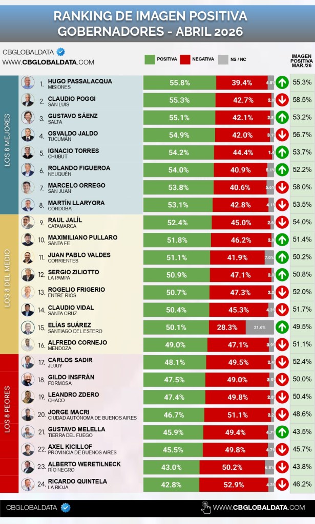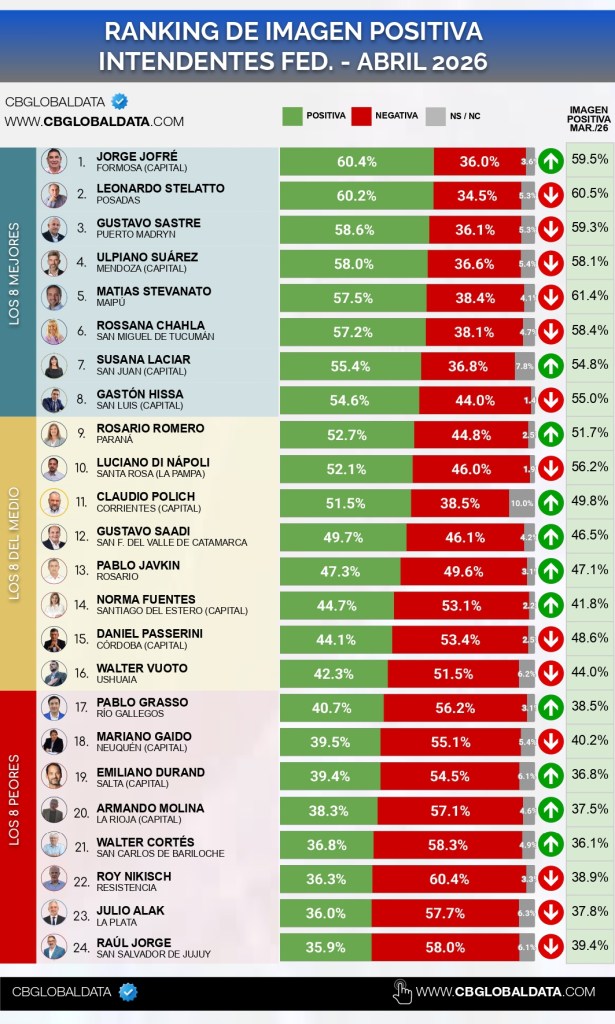 En paralelo, el informe también deja un dato crítico para la capital jujeña: el intendente Raúl Jorge aparece en el último lugar del ranking federal de intendentes, con apenas 35,9% de imagen positiva, cerrando la tabla entre 24 jefes comunales evaluados.
