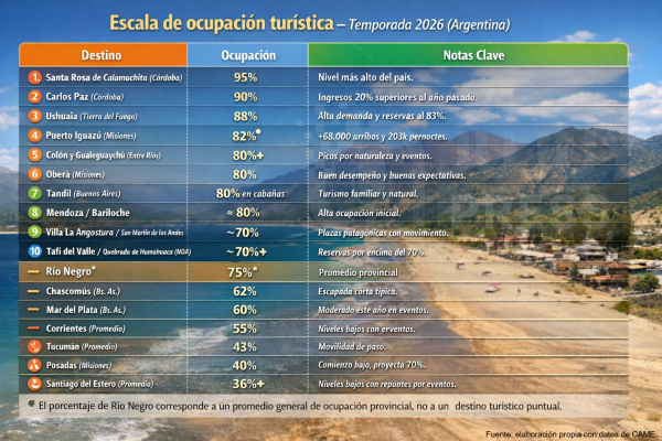 La Quebrada de Humahuaca se ubica entre los diez destinos turísticos con mayor nivel de ocupación en la temporada 2026, de acuerdo con un informe de la Confederación Argentina de la Mediana Empresa (CAME). El relevamiento posiciona al destino jujeño en el décimo lugar a nivel nacional, compartiendo esa ubicación con Tafí del Valle, y... Leer más →